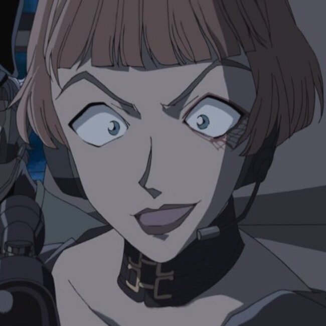 Chianti often wears black leather collars. She has short brown hair, dark lipstick, and her left eyelid has a tattoo of a swallowtail butterfly.